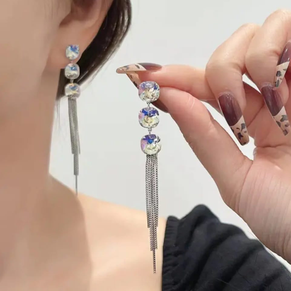 Dazzling and dynamic, these dramatic tassel earrings capture every ray of light. Three expertly faceted, cushion-cut crystals in a vibrant, iridescent shade-reminiscent of Aurora Borealis. Cascade down to a generous silver-toned tassel fringe. The crystals flash with hints of pink, blue, and yellow as they move. They are the perfect, eye-catching statement piece for a formal dinner or gathering, ensuring you truly stand out.