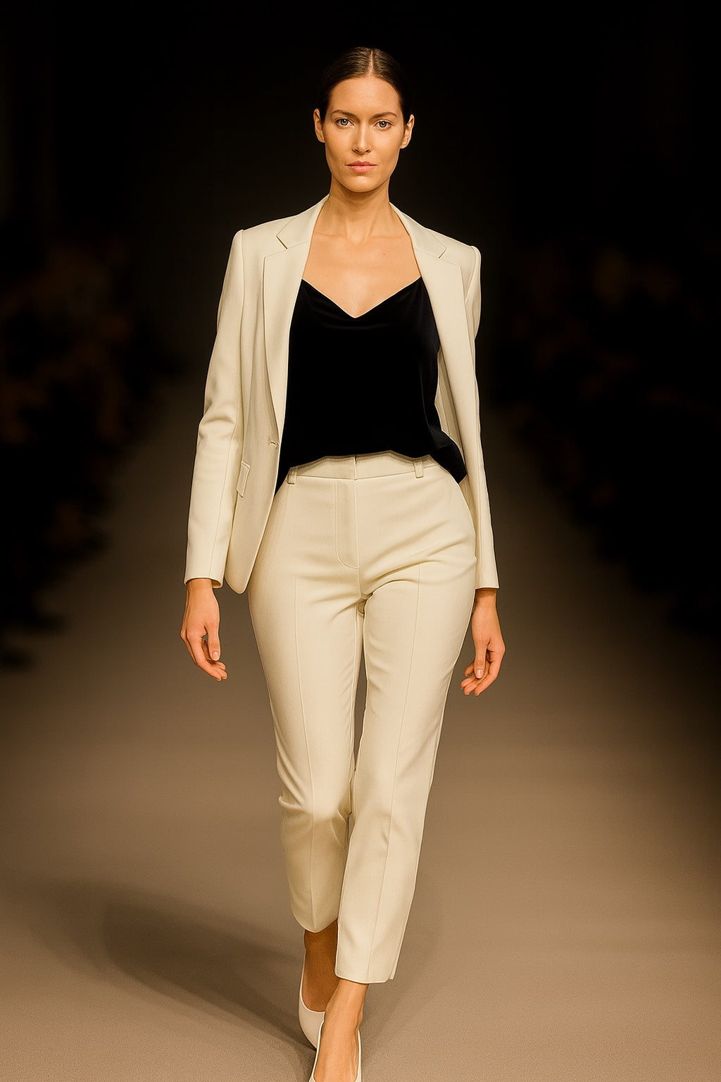 Pair it with ivory trousers and a matching blazer for a striking monochrome statement, or style it with skirts and heels for polished occasionwear. A versatile piece that seamlessly transitions from office elegance to after-hours glamour.