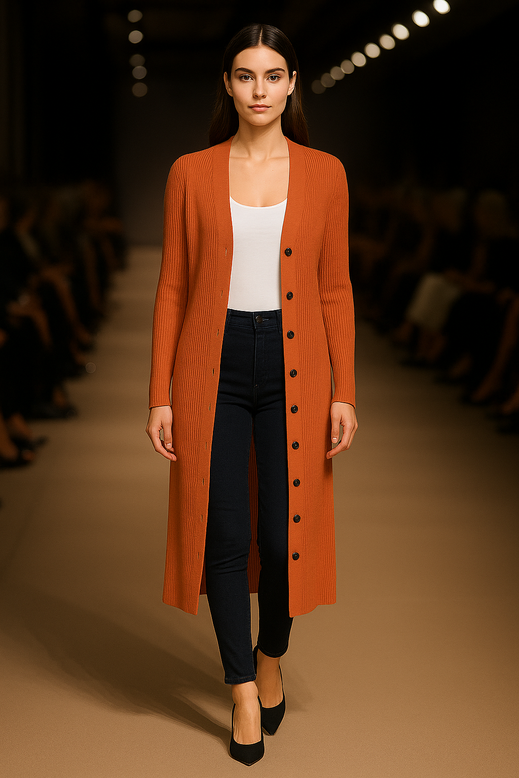 Add a bold pop of color to your wardrobe with this vibrant orange longline cardigan from Forever 21. Crafted in knit with a sleek button-down front, this sweater brings effortless style and comfort. The slim-fit silhouette and ankle-grazing length make it a versatile layering piece for both casual and chic looks.
