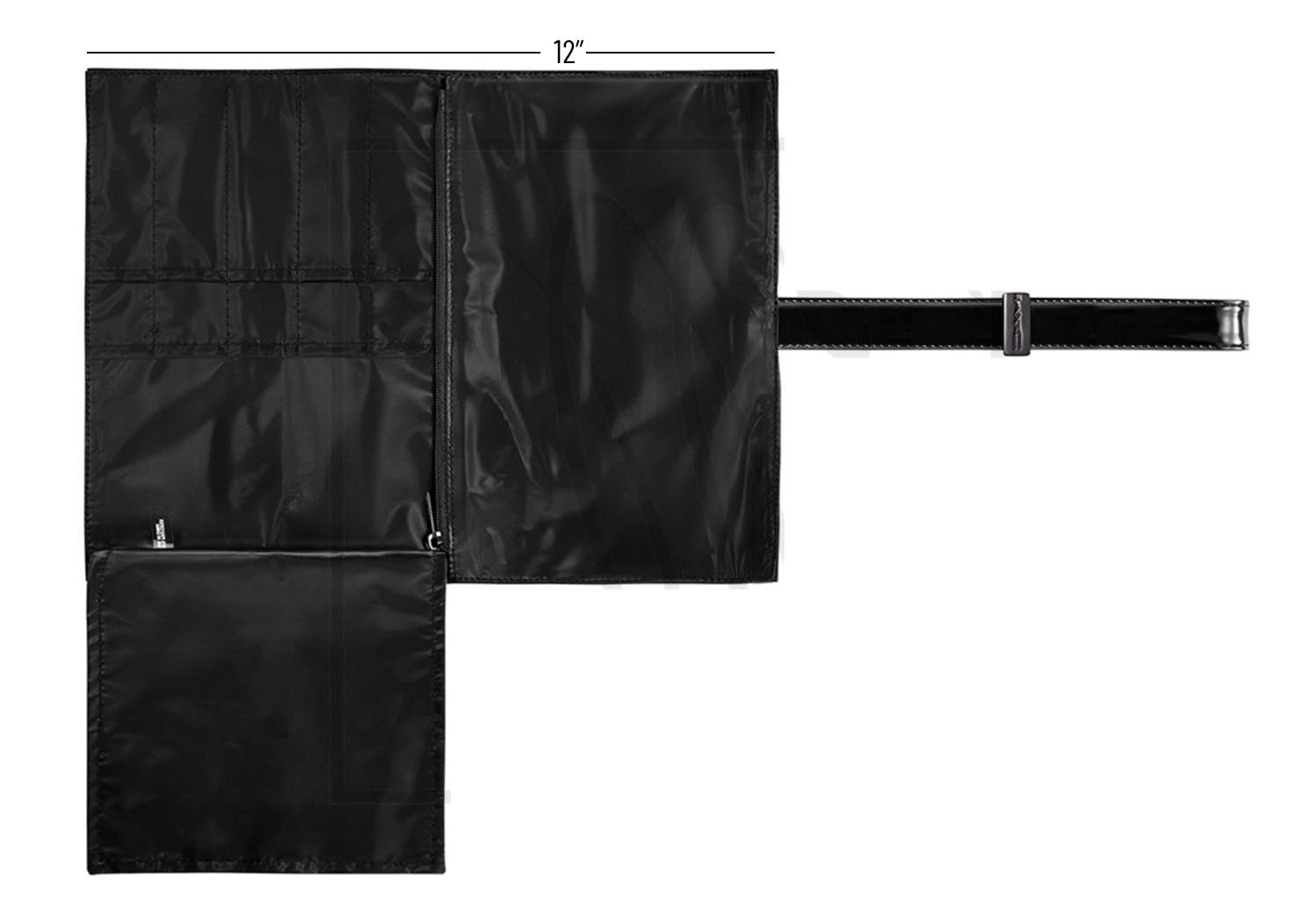 A compact, pro-grade brush roll in easy-clean black nylon with a secure strap, 10 dedicated brush pockets and one interior zip pocket for essentials. Folds to travel; opens flat for quick setup.