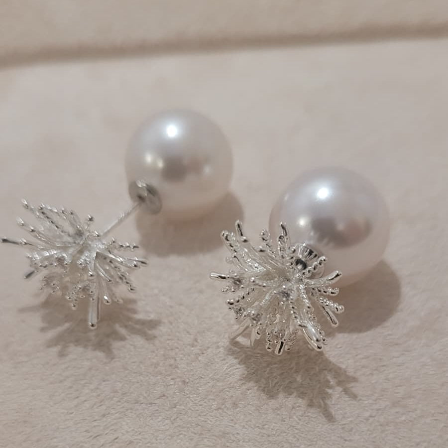 These stunning earrings offer an effortlessly glamorous look with their unique two-part design. The front piece features an intricate silver starburst (or "snowflake") setting, while the back is a beautiful, luminous white pearl sphere.